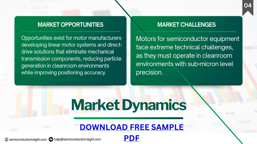 5. help@semiconductorinsight.com semiconductorinsight.com 04 MARKET OPPORTUNITIES MARKET CHALLENGES Opportunities exist for motor manufacturers developing linear motor systems and direct-drive solutions that eliminate mechanical transmission components, reducing particle generation in cleanroom environments while improving positioning accuracy. Motors for semiconductor equipment face extreme technical challenges, as they must operate in cleanroom environments with sub-micron level precision. Market Dynamics DOWNLOAD FREE SAMPLE PDF