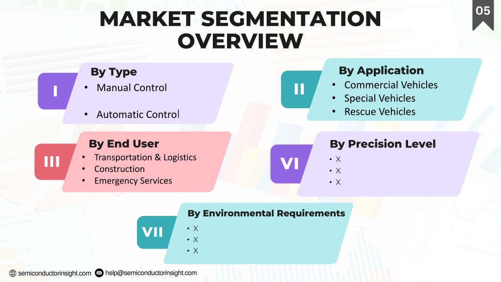 6. help@semiconductorinsight.com semiconductorinsight.com • MARKET SEGMENTATION OVERVIEW 05 • By Application • By Type • Commercial Vehicles • Special Vehicles • Rescue Vehicles • II • I • Manual Control • Automatic Control • By End User • By Precision Level • III • Transportation & Logistics • Construction • Emergency Services • VI • X • X • X • By Environmental Requirements • VII • X • X • X