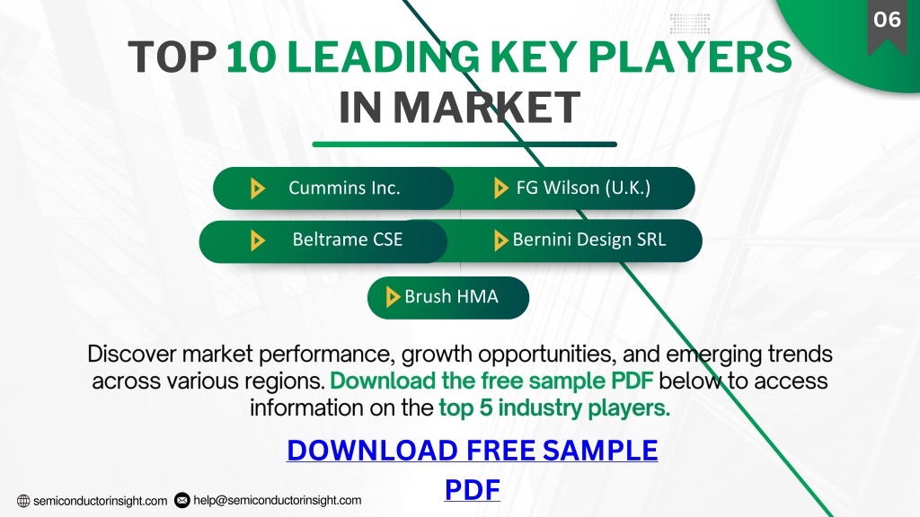7. help@semiconductorinsight.com semiconductorinsight.com 06 TOP 10 LEADING KEY PLAYERS IN MARKET Cummins Inc. FG Wilson (U.K.) Beltrame CSE Bernini Design SRL Brush HMA  Discover market performance, growth opportunities, and emerging trends across various regions. Download the free sample PDF below to access information on the top 5 industry players. DOWNLOAD FREE SAMPLE PDF