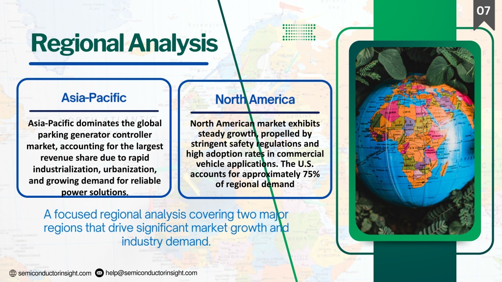 8. help@semiconductorinsight.com semiconductorinsight.com 07 Regional Analysis Asia-Pacific North America Asia-Pacific dominates the global parking generator controller market, accounting for the largest revenue share due to rapid industrialization, urbanization, and growing demand for reliable power solutions. North American market exhibits steady growth, propelled by stringent safety regulations and high adoption rates in commercial vehicle applications. The U.S. accounts for approximately 75% of regional demand A focused regional analysis covering two major regions that drive significant market growth and industry demand.