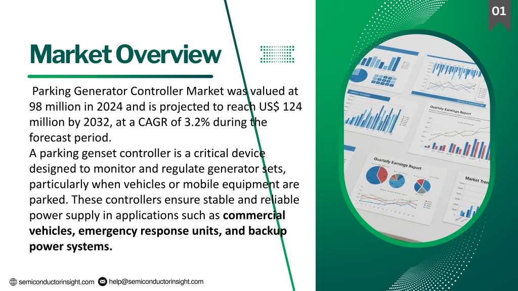 2. help@semiconductorinsight.com semiconductorinsight.com 01 Market Overview  Parking Generator Controller Market was valued at 98 million in 2024 and is projected to reach US$ 124 million by 2032, at a CAGR of 3.2% during the forecast period. A parking genset controller is a critical device designed to monitor and regulate generator sets, particularly when vehicles or mobile equipment are parked. These controllers ensure stable and reliable power supply in applications such as commercial vehicles, emergency response units, and backup power systems.
