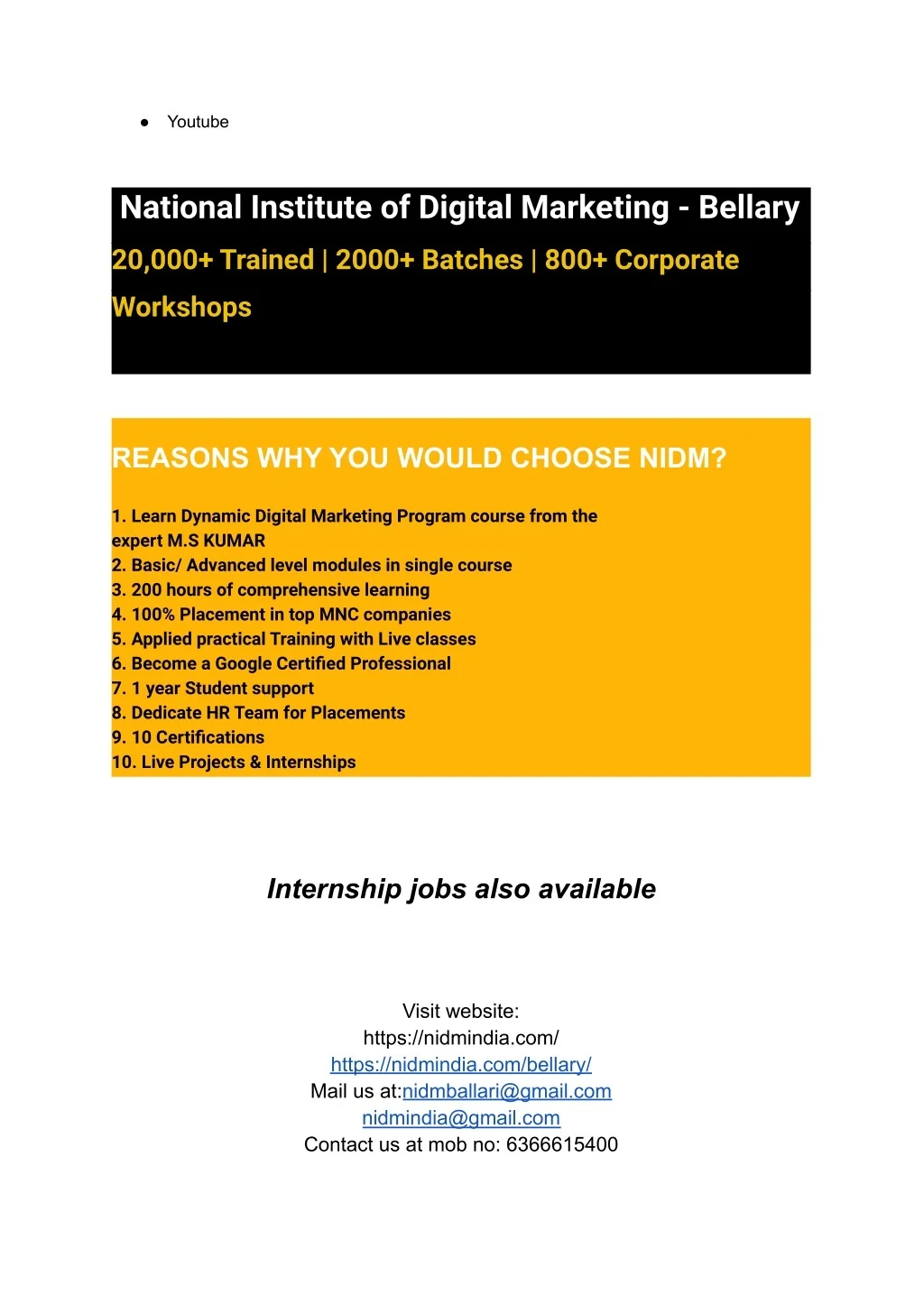 ● Youtube National Institute of Digital Marketing - Bellary 20,000+ Trained | 2000+ Batches | 800+ Corporate Workshops REASONS WHY YOU WOULD CHOOSE NIDM? 1. Learn Dynamic Digital Marketing Program course from the expert M.S KUMAR 2. Basic/ Advanced level modules in single course 3. 200 hours of comprehensive learning 4. 100% Placement in top MNC companies 5. Applied practical Training with Live classes 6. Become a Google Certified Professional 7. 1 year Student support 8. Dedicate HR Team for Placements 9. 10 Certifications 10. Live Projects & Internships Internship jobs also available Visit website: https://nidmindia.com/ https://nidmindia.com/bellary/ Mail us at:nidmballari@gmail.com nidmindia@gmail.com Contact us at mob no: 6366615400