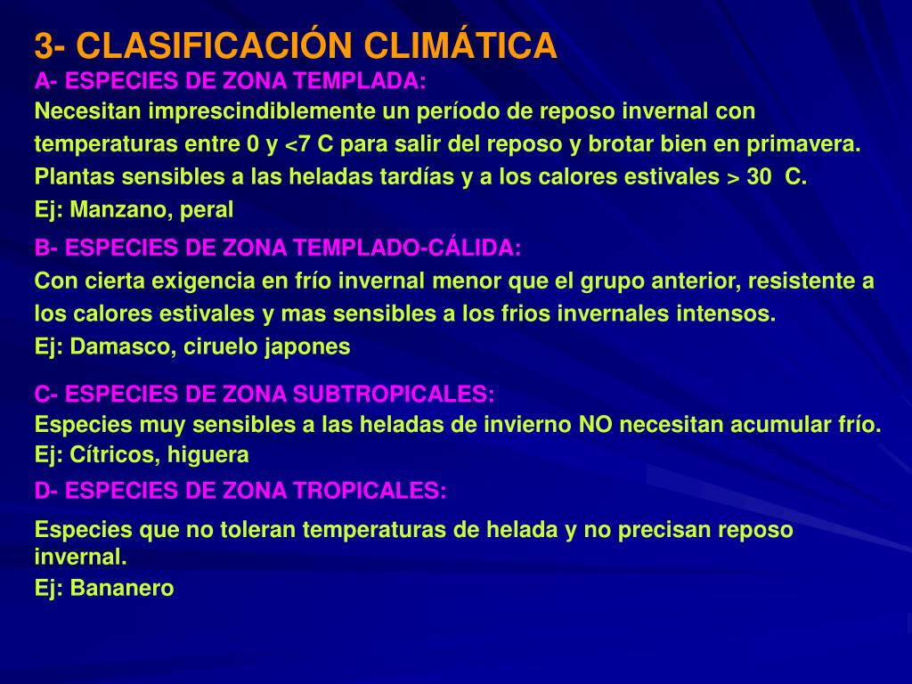 3- CLASIFICACIÓN CLIMÁTICA A- ESPECIES DE ZONA TEMPLADA: Necesitan imprescindiblemente un período de reposo invernal con temperaturas entre 0 y <7 C para salir del reposo y brotar bien en primavera. Plantas sensibles a las heladas tardías y a los calores estivales > 30 C. Ej: Manzano, peral B- ESPECIES DE ZONA TEMPLADO-CÁLIDA: Con cierta exigencia en frío invernal menor que el grupo anterior, resistente a los calores estivales y mas sensibles a los frios invernales intensos. Ej: Damasco, ciruelo japones C- ESPECIES DE ZONA SUBTROPICALES: Especies muy sensibles a las heladas de invierno NO necesitan acumular frío. Ej: Cítricos, higuera D- ESPECIES DE ZONA TROPICALES: Especies que no toleran temperaturas de helada y no precisan reposo invernal. Ej: Bananero