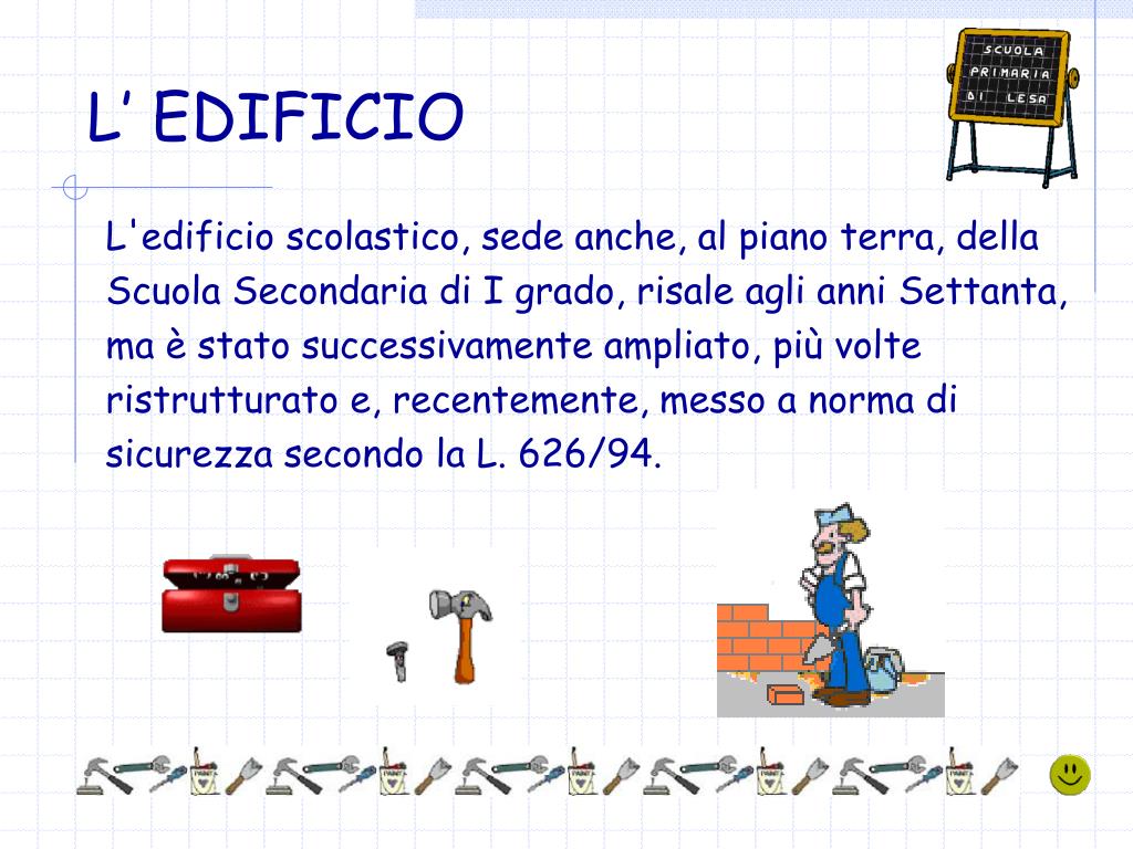 L’ EDIFICIO L'edificio scolastico, sede anche, al piano terra, della Scuola Secondaria di I grado, risale agli anni Settanta, ma è stato successivamente ampliato, più volte ristrutturato e, recentemente, messo a norma di sicurezza secondo la L. 626/94.