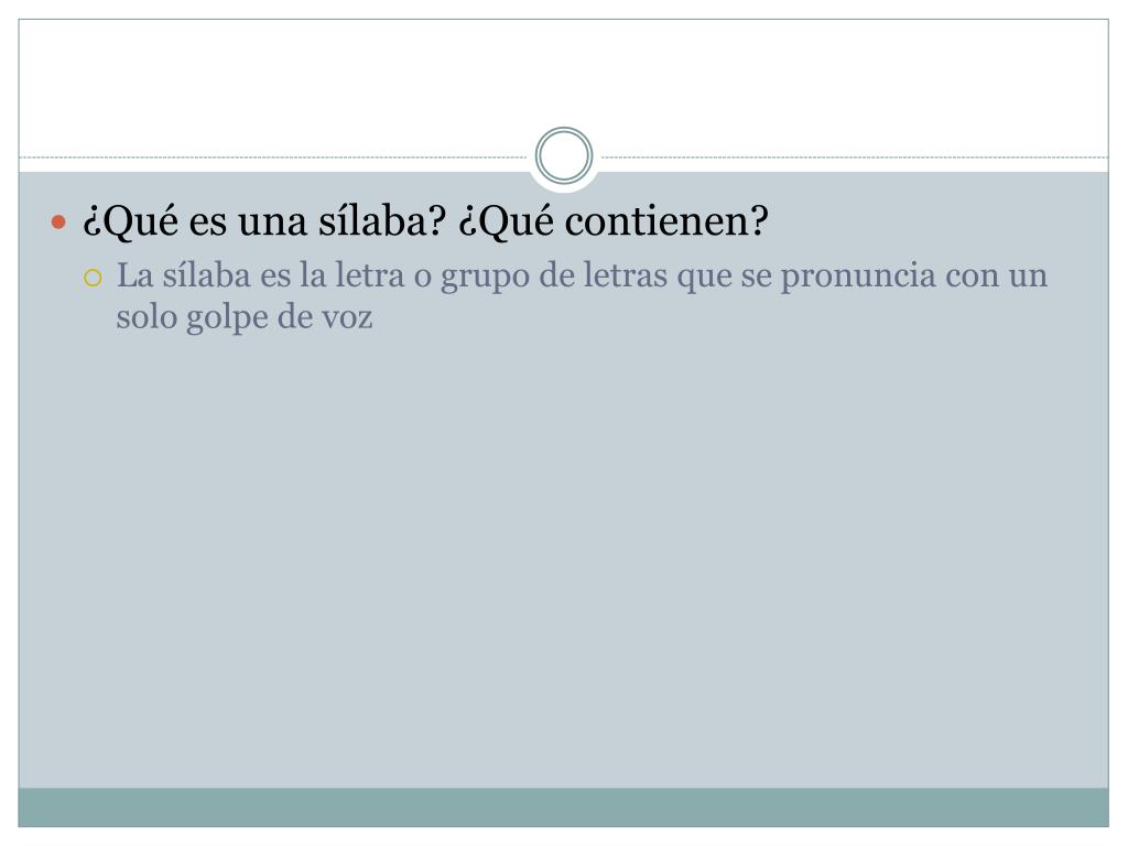 ¿Qué es una sílaba? ¿Qué contienen? • La sílaba es la letra o grupo de letras que se pronuncia con un solo golpe de voz