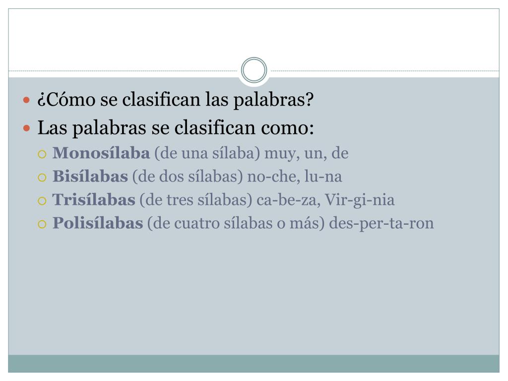 ¿Cómo se clasifican las palabras? • Las palabras se clasifican como: • Monosílaba (de una sílaba) muy, un, de • Bisílabas (de dos sílabas) no-che, lu-na • Trisílabas (de tres sílabas) ca-be-za, Vir-gi-nia • Polisílabas (de cuatro sílabas o más) des-per-ta-ron