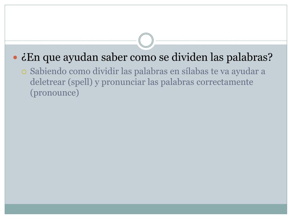 ¿En que ayudan saber como se dividen las palabras? • Sabiendo como dividir las palabras en sílabas te va ayudar a deletrear (spell) y pronunciar las palabras correctamente (pronounce)