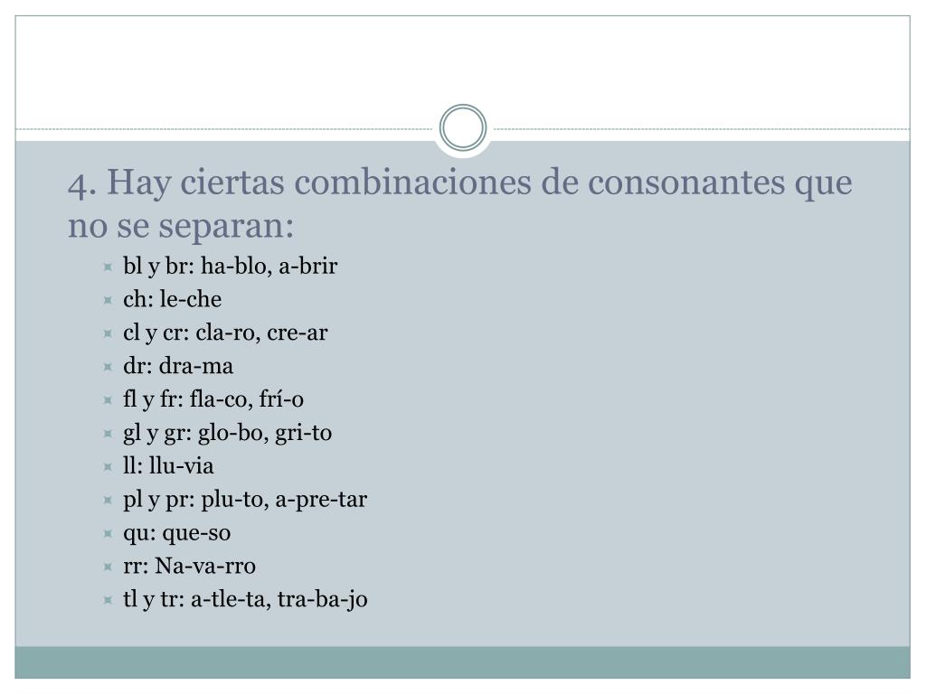 4. Hay ciertas combinaciones de consonantes que no se separan: • bl y br: ha-blo, a-brir • ch: le-che • cl y cr: cla-ro, cre-ar • dr: dra-ma • fl y fr: fla-co, frí-o • gl y gr: glo-bo, gri-to • ll: llu-via • pl y pr: plu-to, a-pre-tar • qu: que-so • rr: Na-va-rro • tl y tr: a-tle-ta, tra-ba-jo