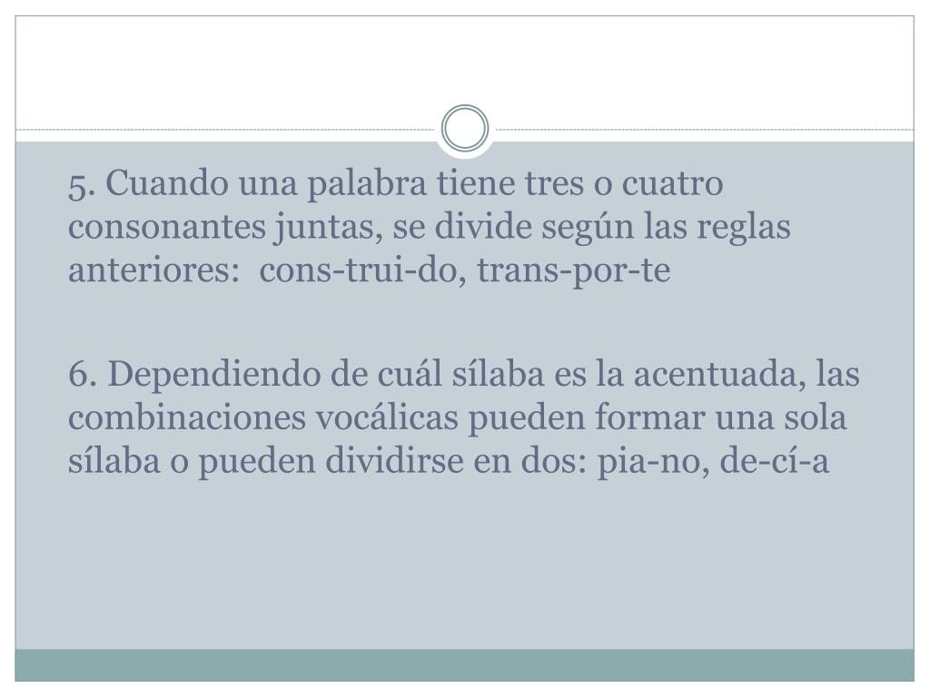 5. Cuando una palabra tiene tres o cuatro consonantes juntas, se divide según las reglas anteriores: cons-trui-do, trans-por-te 6. Dependiendo de cuál sílaba es la acentuada, las combinaciones vocálicas pueden formar una sola sílaba o pueden dividirse en dos: pia-no, de-cí-a