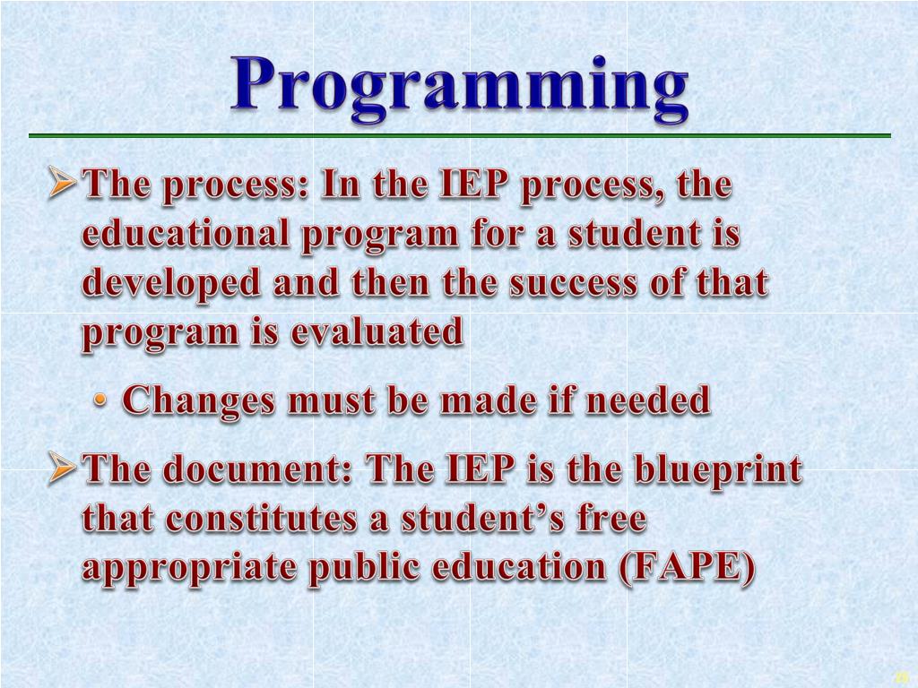 Programming • The process: In the IEP process, the educational program for a student is developed and then the success of that program is evaluated • Changes must be made if needed • The document: The IEP is the blueprint that constitutes a student’s free appropriate public education (FAPE)