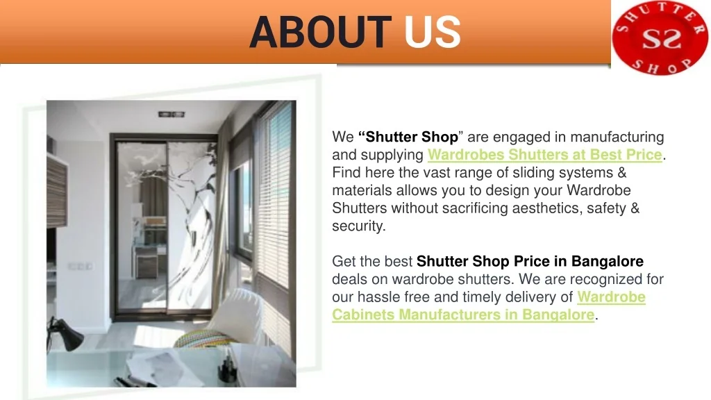 We u201cShutter Shopu201d are engaged in manufacturing and supplying Wardrobes Shutters at Best Price. Find here the vast range of sliding systems & materials allows you to design your Wardrobe Shutters without sacrificing aesthetics, safety & security. <br>Get the best Shutter Shop Price in Bangalore deals on wardrobe shutters. We are recognized for our hassle free and timely delivery of wardrobe cabinets manufacturers in Bangalore.<br>
