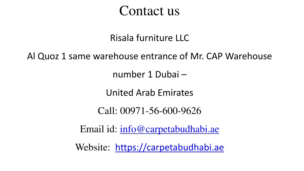 Risala furniture LLC Al Quoz 1 same warehouse entrance of Mr. CAP Warehouse number 1 Dubai – United Arab Emirates Call: 00971-56-600-9626 Email id: info@carpetabudhabi.ae Website: https://carpetabudhabi.ae Contact us