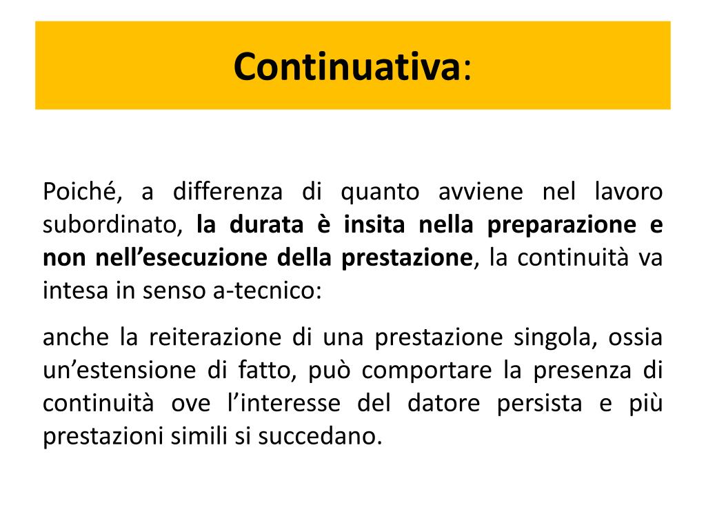Continuativa: Poiché, a differenza di quanto avviene nel lavoro subordinato, la durata è insita nella preparazione e non nell’esecuzione della prestazione, la continuità va intesa in senso a-tecnico: anche la reiterazione di una prestazione singola, ossia un’estensione di fatto, può comportare la presenza di continuità ove l’interesse del datore persista e più prestazioni simili si succedano.