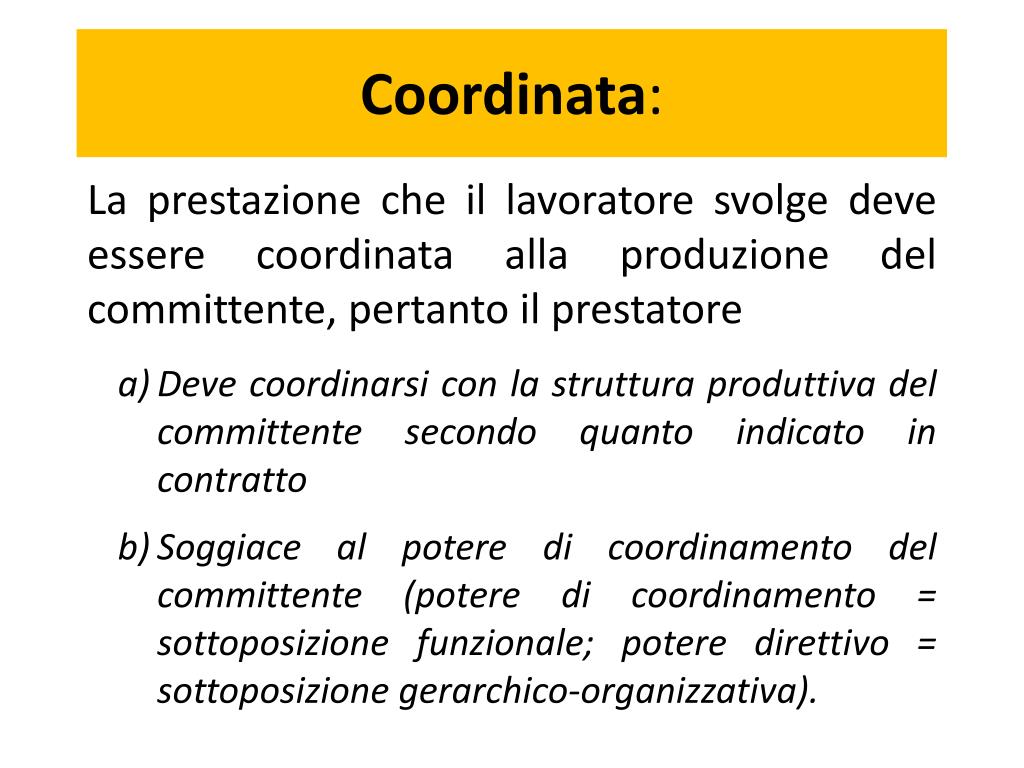 Coordinata: La prestazione che il lavoratore svolge deve essere coordinata alla produzione del committente, pertanto il prestatore • Deve coordinarsi con la struttura produttiva del committente secondo quanto indicato in contratto • Soggiace al potere di coordinamento del committente (potere di coordinamento = sottoposizione funzionale; potere direttivo = sottoposizione gerarchico-organizzativa).