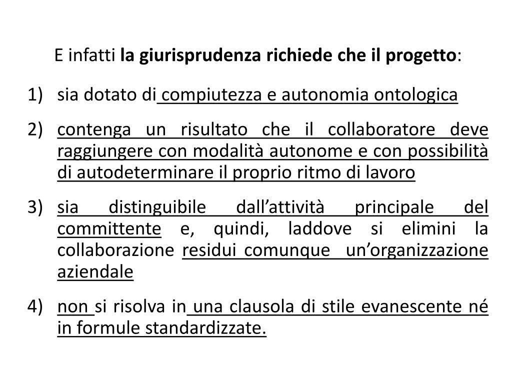 E infatti la giurisprudenza richiedeche il progetto: • sia dotato di compiutezza e autonomia ontologica • contenga un risultato che il collaboratore deve raggiungere con modalità autonome e con possibilità di autodeterminare il proprio ritmo di lavoro • sia distinguibile dall’attività principale del committente e, quindi, laddove si elimini la collaborazione residui comunque un’organizzazione aziendale • non si risolva in una clausola di stile evanescente né in formule standardizzate.