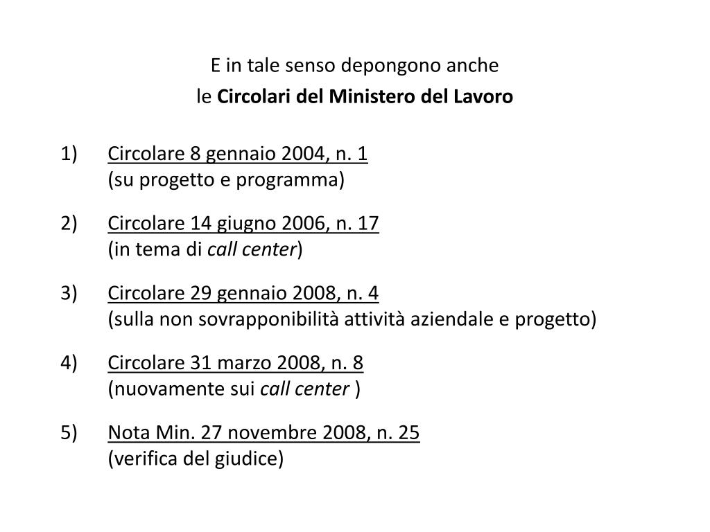 E in tale senso depongono anche le Circolari del Ministero del Lavoro • Circolare 8 gennaio 2004, n. 1(su progetto e programma) • Circolare 14 giugno 2006, n. 17(in tema di call center) • Circolare 29 gennaio 2008, n. 4(sulla non sovrapponibilità attività aziendale e progetto) • Circolare 31 marzo 2008, n. 8(nuovamente sui call center) • Nota Min. 27 novembre 2008, n. 25(verifica del giudice)