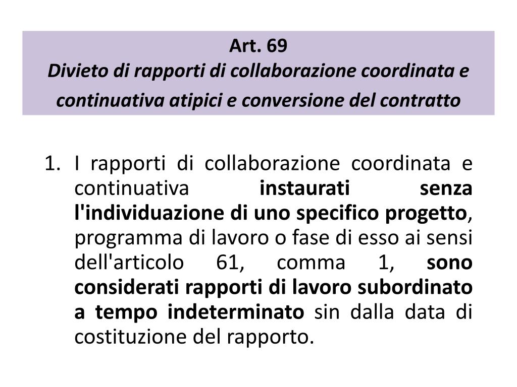 Art. 69 Divieto di rapporti di collaborazione coordinata e continuativa atipici e conversione del contratto 1. I rapporti di collaborazione coordinata e continuativa instaurati senza l'individuazione di uno specifico progetto, programma di lavoro o fase di esso ai sensi dell'articolo 61, comma 1, sono considerati rapporti di lavoro subordinato a tempo indeterminato sin dalla data di costituzione del rapporto.