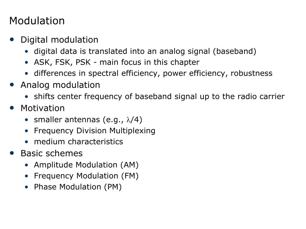 Modulation • Digital modulation • digital data is translated into an analog signal (baseband) • ASK, FSK, PSK - main focus in this chapter • differences in spectral efficiency, power efficiency, robustness • Analog modulation • shifts center frequency of baseband signal up to the radio carrier • Motivation • smaller antennas (e.g., /4) • Frequency Division Multiplexing • medium characteristics • Basic schemes • Amplitude Modulation (AM) • Frequency Modulation (FM) • Phase Modulation (PM)