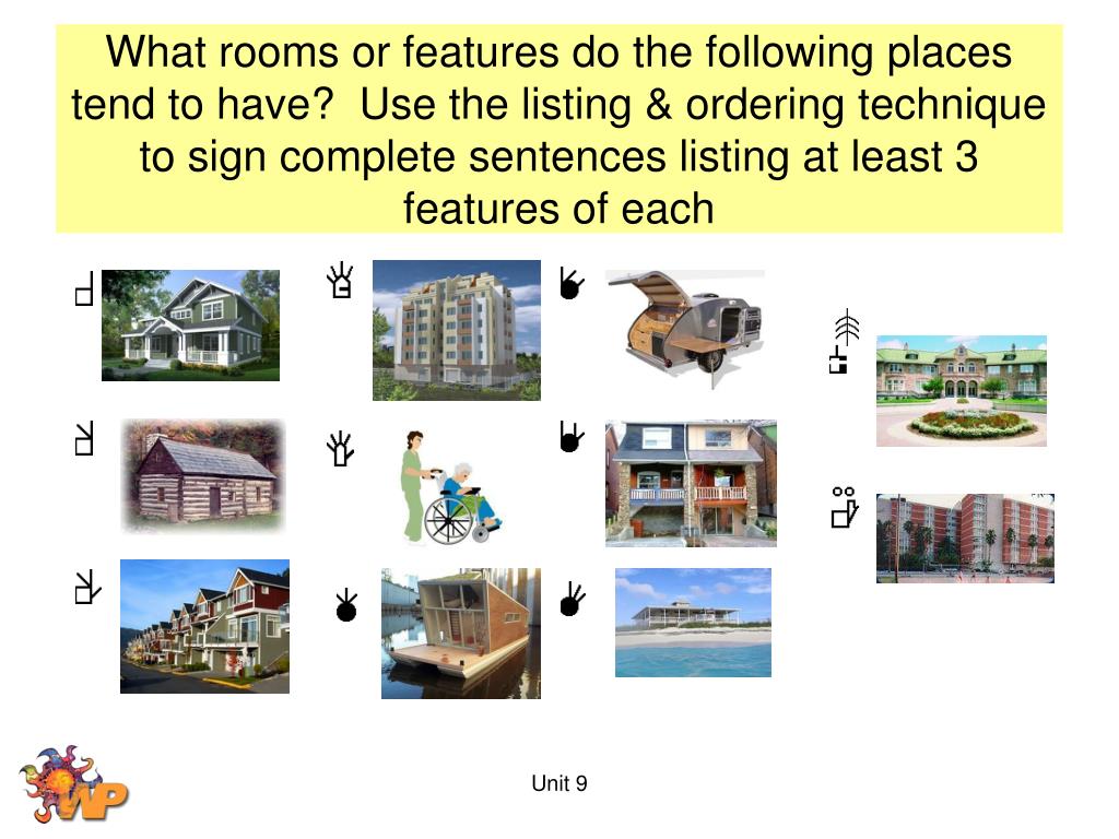 What rooms or features do the following places tend to have? Use the listing & ordering technique to sign complete sentences listing at least 3 features of each Unit 9