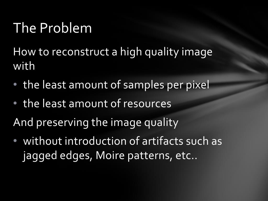 The Problem • How to reconstruct a high quality image with • the least amount of samples per pixel • the least amount of resources • And preserving the image quality • without introduction of artifacts such as jagged edges, Moire patterns, etc..