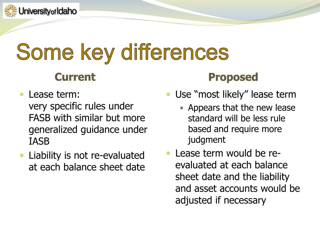 Some key differences Current Proposed • Lease term:very specific rules under FASB with similar but more generalized guidance under IASB • Liability is not re-evaluated at each balance sheet date • Use “most likely” lease term • Appears that the new lease standard will be less rule based and require more judgment • Lease term would be re-evaluated at each balance sheet date and the liability and asset accounts would be adjusted if necessary