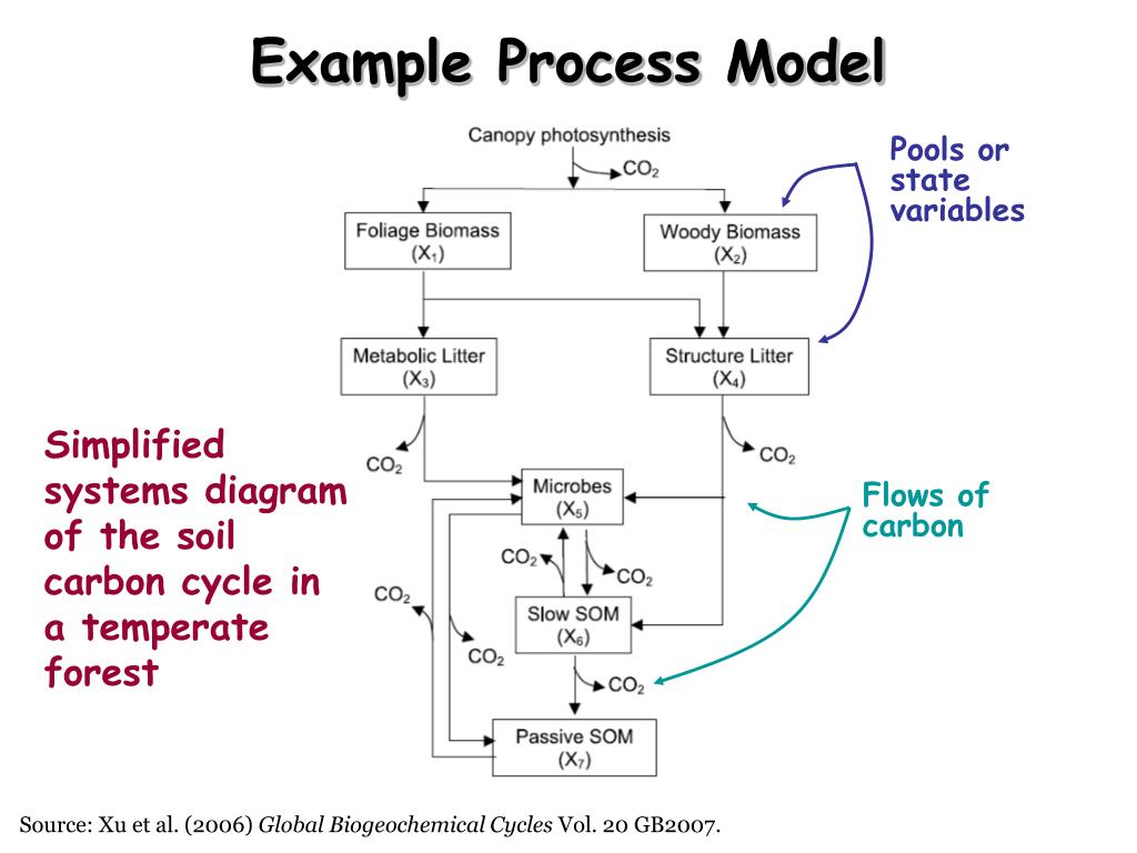 Example Process Model Pools or state variables Simplified systems diagram of the soil carbon cycle in a temperate forest Flows of carbon Source: Xu et al. (2006) Global Biogeochemical Cycles Vol. 20 GB2007.