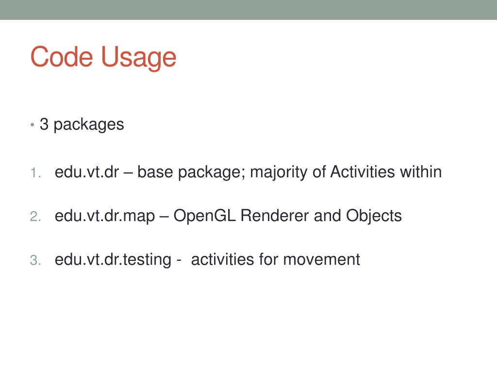 Code Usage • 3packages • edu.vt.dr – base package; majority of Activities within • edu.vt.dr.map – OpenGL Renderer and Objects • edu.vt.dr.testing - activities for movement