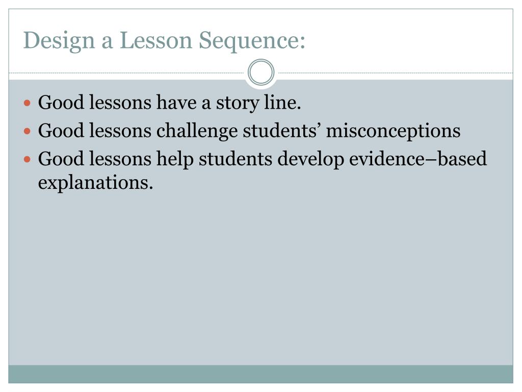 Design a Lesson Sequence: • Good lessons have a story line. • Good lessons challenge students’ misconceptions • Good lessons help students develop evidence–based explanations.