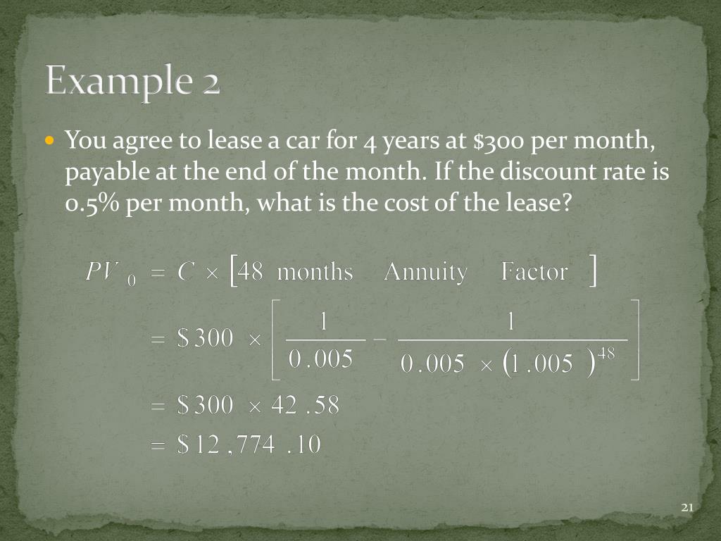 Example 2 • You agree to lease a car for 4 years at $300 per month, payable at the end of the month. If the discount rate is 0.5% per month, what is the cost of the lease?