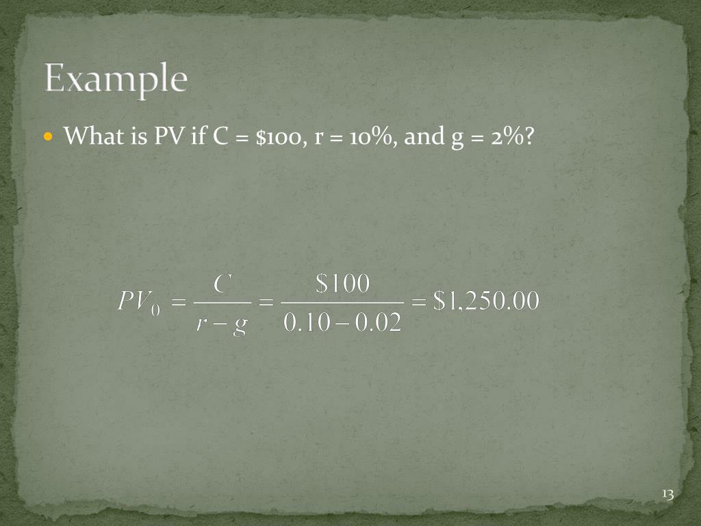 Example • What is PV if C = $100, r = 10%, and g = 2%?
