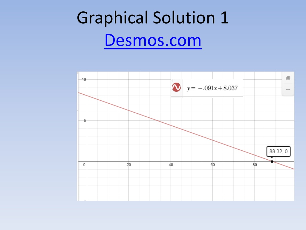 Algebraic Solution • y = -0.089x + 183.9 • 0 = -0.089x + 183.9 • X= 2066.291 • Wow ! Compare to the previous model.