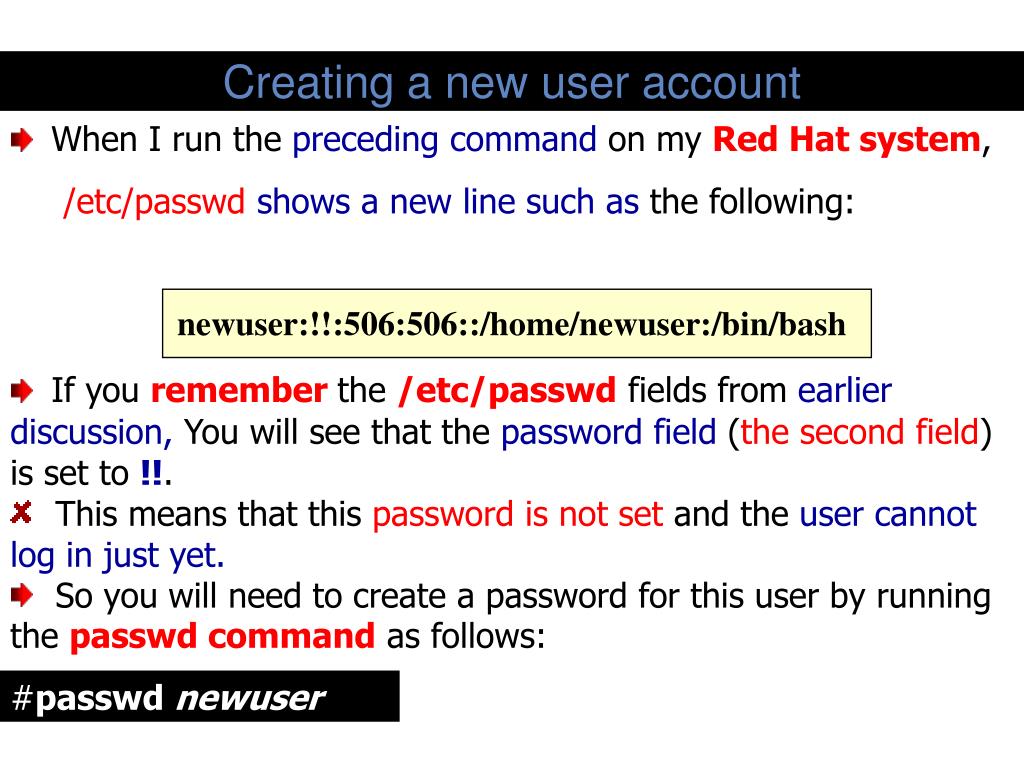 Creating a new user account • When I run the preceding command on my Red Hat system, • /etc/passwdshows a new line such as the following: • newuser:!!:506:506::/home/newuser:/bin/bash • If you remember the /etc/passwd fields from earlier discussion, You will see that the password field (the second field) is set to !!. • This means that this password is not set and the user cannot log in just yet. • So you will need to create a password for this user by running the passwd command as follows: #passwd newuser