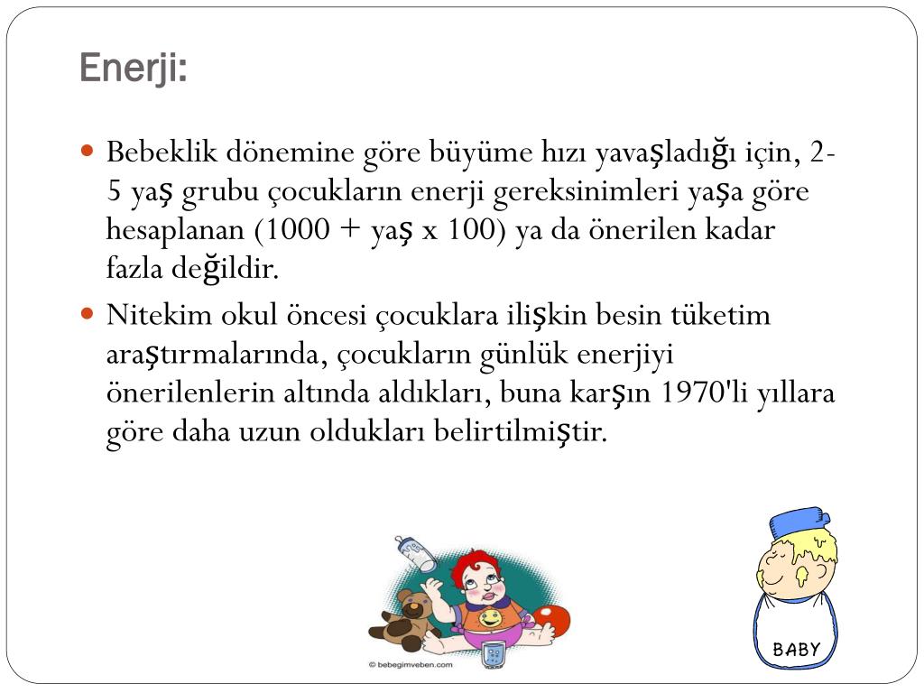 Enerji: • Bebeklik dönemine göre büyüme hızı yavaşladığı için, 2-5 yaş grubu çocukların enerji gereksinimleri yaşa göre hesaplanan (1000 + yaş x 100) ya da önerilen kadar fazla değildir. • Nitekim okul öncesi çocuklara ilişkin besin tüketim araştırmalarında, çocukların günlük enerjiyi önerilenlerin altında aldıkları, buna karşın 1970'li yıllara göre daha uzun oldukları belirtilmiştir.