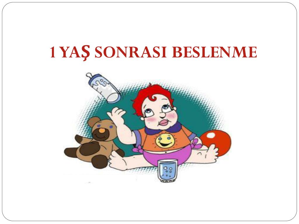1 yaş sonrası beslenme • Bu dönemde katı besin alımı artırılarak süt alımı azaltılmalıdır. • Süt tüketimi günde 500 ml yi geçmemelidir. Aşırı süt tüketimi enerjisini bu kaynaktan sağlayan çocuğun açlık duymaması, katı besin tüketimini ve diğer gıdalara olan ilgisini azaltır. Aynı zamanda inek sütü alerjisi nedeni ile barsaklarda kan kayıplarına neden olacaktır.