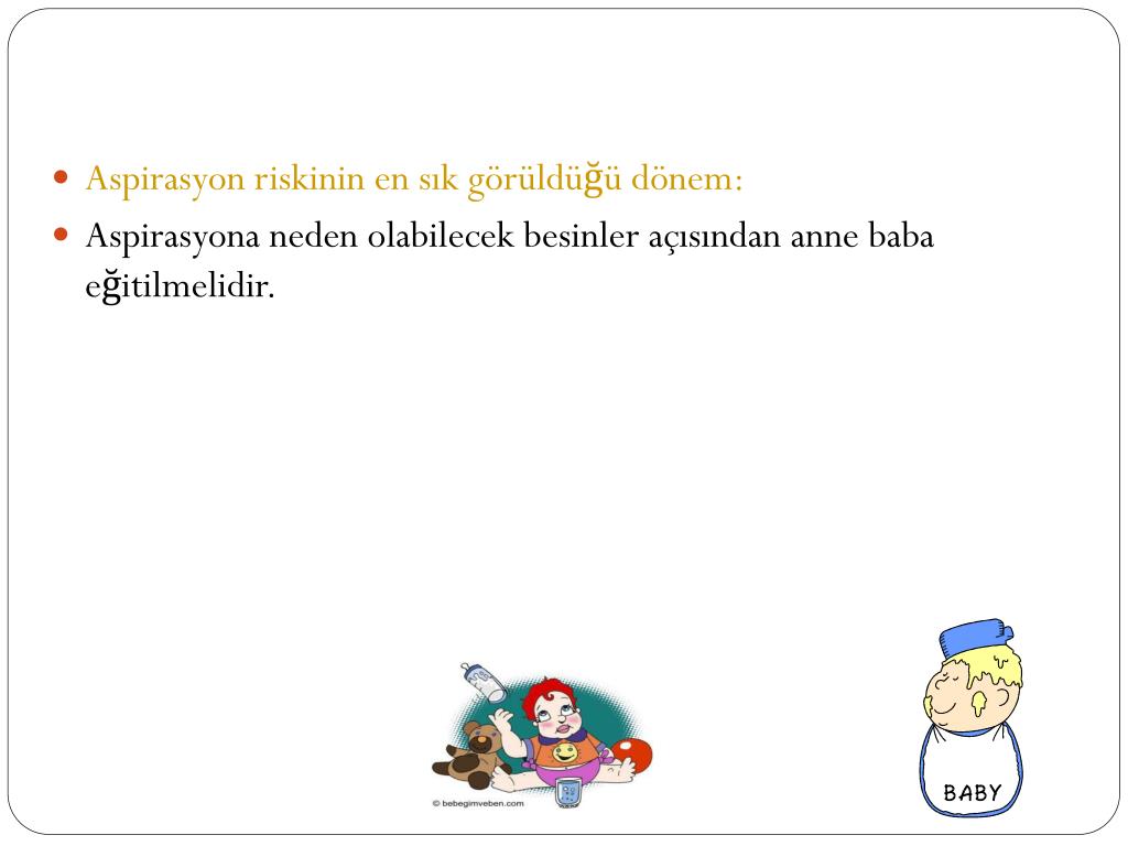 Aspirasyon riskinin en sık görüldüğü dönem: • Aspirasyona neden olabilecek besinler açısından anne baba eğitilmelidir.