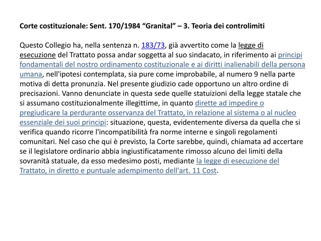 Corte costituzionale: Sent. 170/1984 “ Granital ” – 3. Teoria dei controlimiti