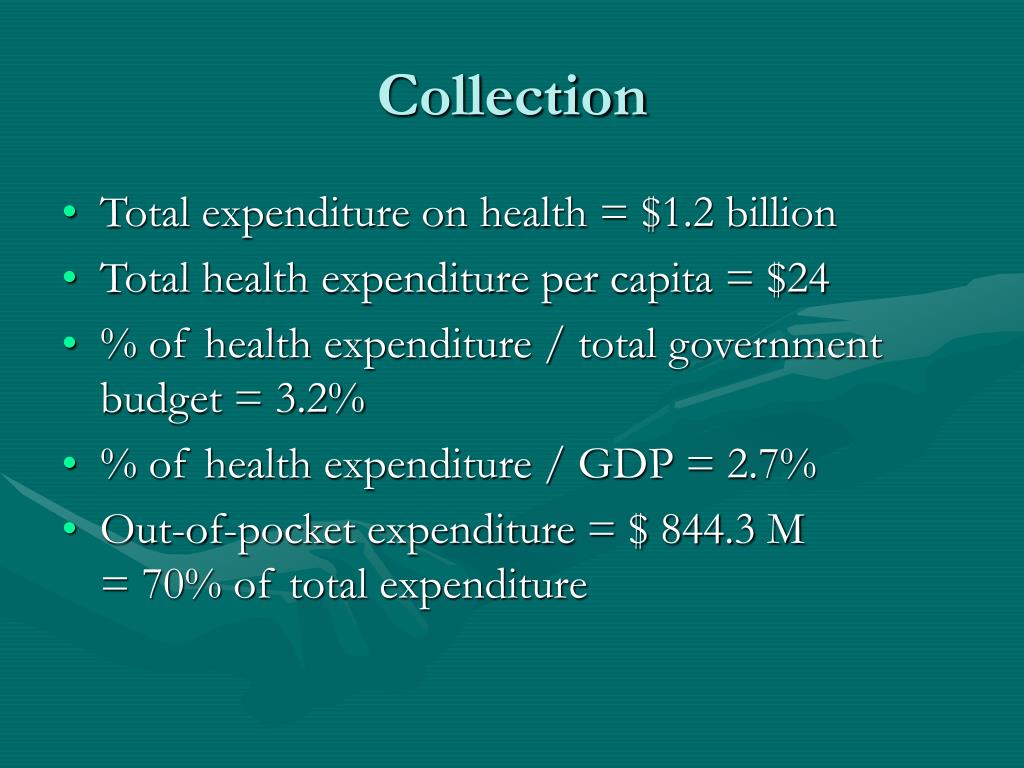 Collection • Total expenditure on health = $1.2 billion • Total health expenditure per capita = $24 • % of health expenditure / total government budget = 3.2% • % of health expenditure / GDP = 2.7% • Out-of-pocket expenditure = $ 844.3 M = 70% of total expenditure