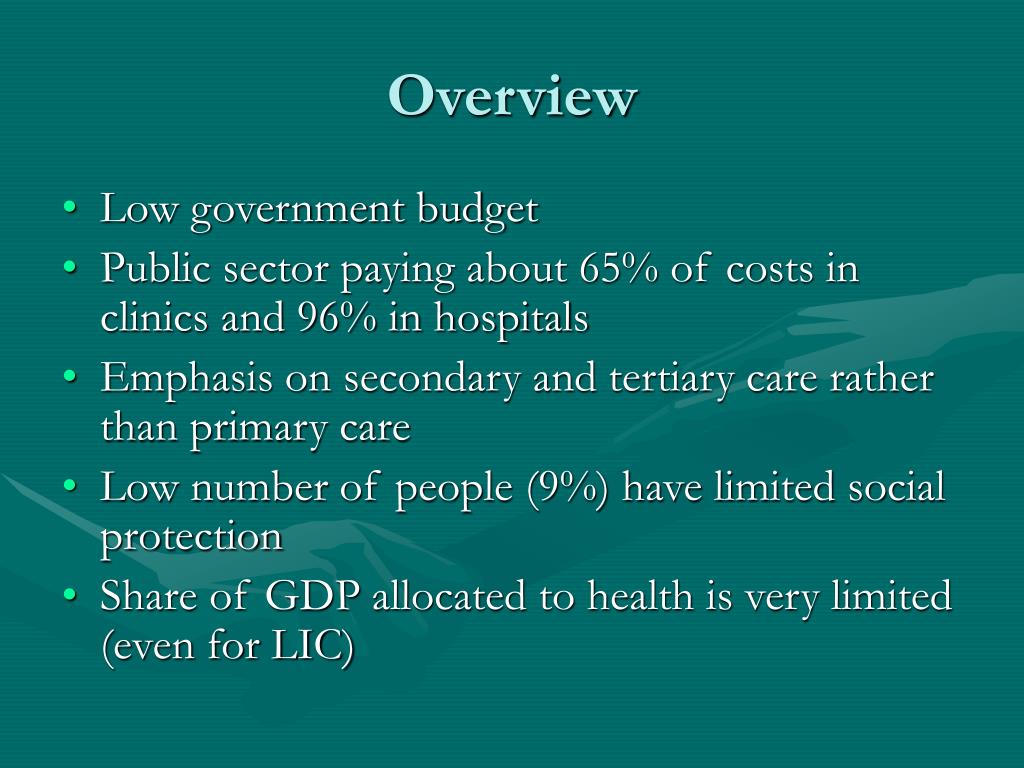 Overview • Low government budget • Public sector paying about 65% of costs in clinics and 96% in hospitals • Emphasis on secondary and tertiary care rather than primary care • Low number of people (9%) have limited social protection • Share of GDP allocated to health is very limited (even for LIC)