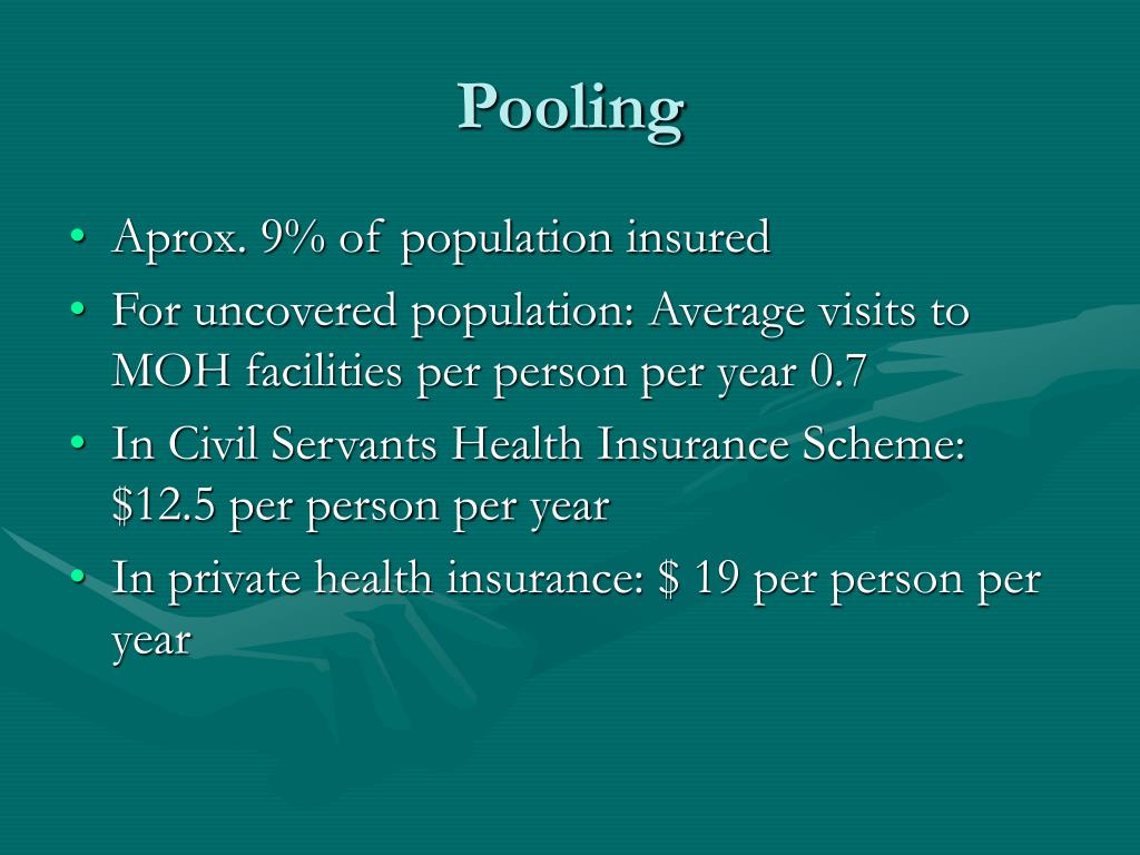 Pooling • Aprox. 9% of population insured • For uncovered population: Average visits to MOH facilities per person per year 0.7 • In Civil Servants Health Insurance Scheme: $12.5 per person per year • In private health insurance: $ 19 per person per year