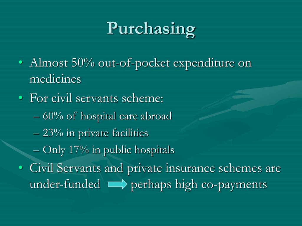 Purchasing • Almost 50% out-of-pocket expenditure on medicines • For civil servants scheme: • 60% of hospital care abroad • 23% in private facilities • Only 17% in public hospitals • Civil Servants and private insurance schemes are under-funded perhaps high co-payments