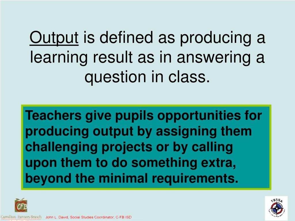 Output is defined as producing a learning result as in answering a question in class. Teachers give pupils opportunities for producing output by assigning them challenging projects or by calling upon them to do something extra, beyond the minimal requirements.