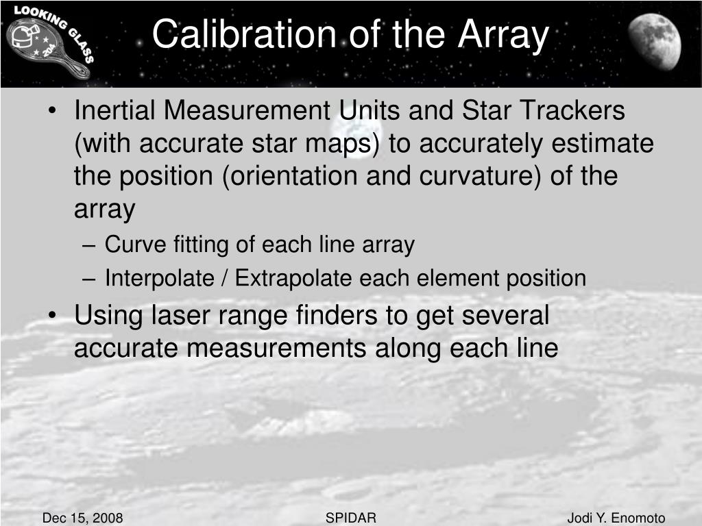 Calibration Inertial Measurement Units and Star Trackers (with accurate star maps) to accurately estimate the position (orientation and curvature) of the array Curve fitting of each line array Interpolate / Extrapolate each element position Using laser range finders to get several accurate measurements along each line. Dec 15, 2008 SPIDAR