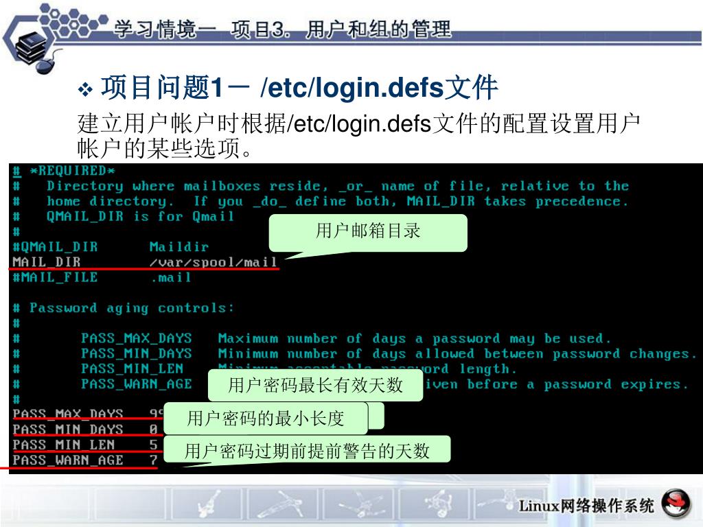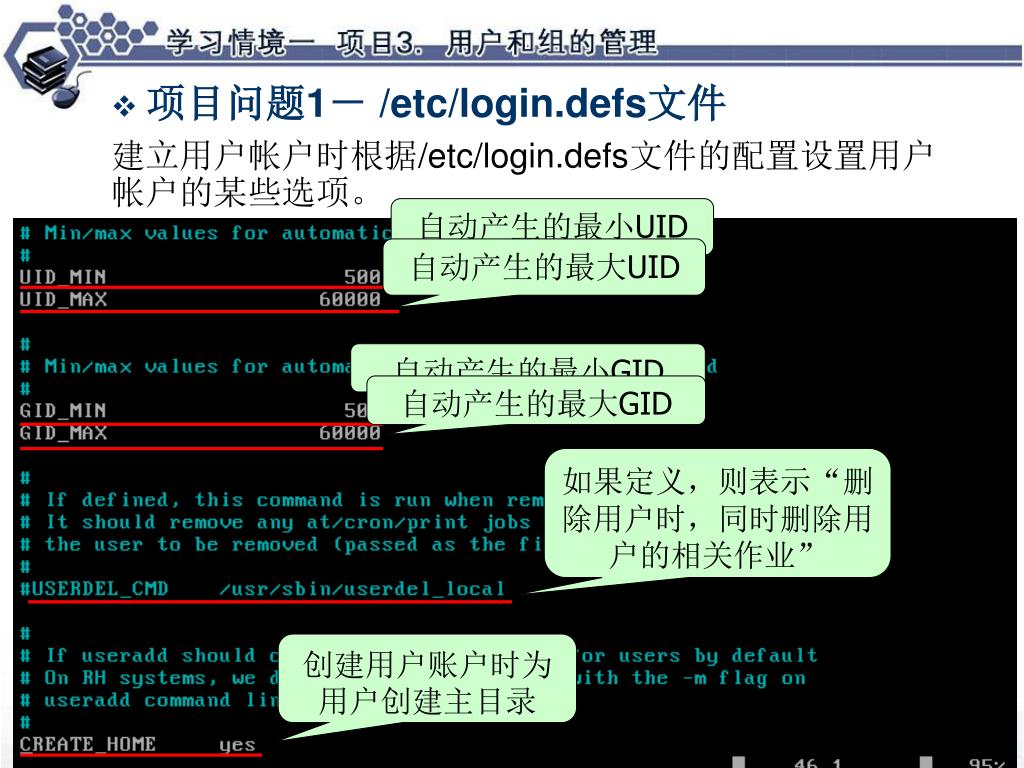 项目问题1- /etc/login.defs文件 建立用户帐户时根据/etc/login.defs文件的配置设置用户帐户的某些选项。 自动产生的最小UID 自动产生的最大UID 自动产生的最小GID 自动产生的最大GID 如果定义,则表示“删除用户时,同时删除用户的相关作业” 创建用户账户时为用户创建主目录