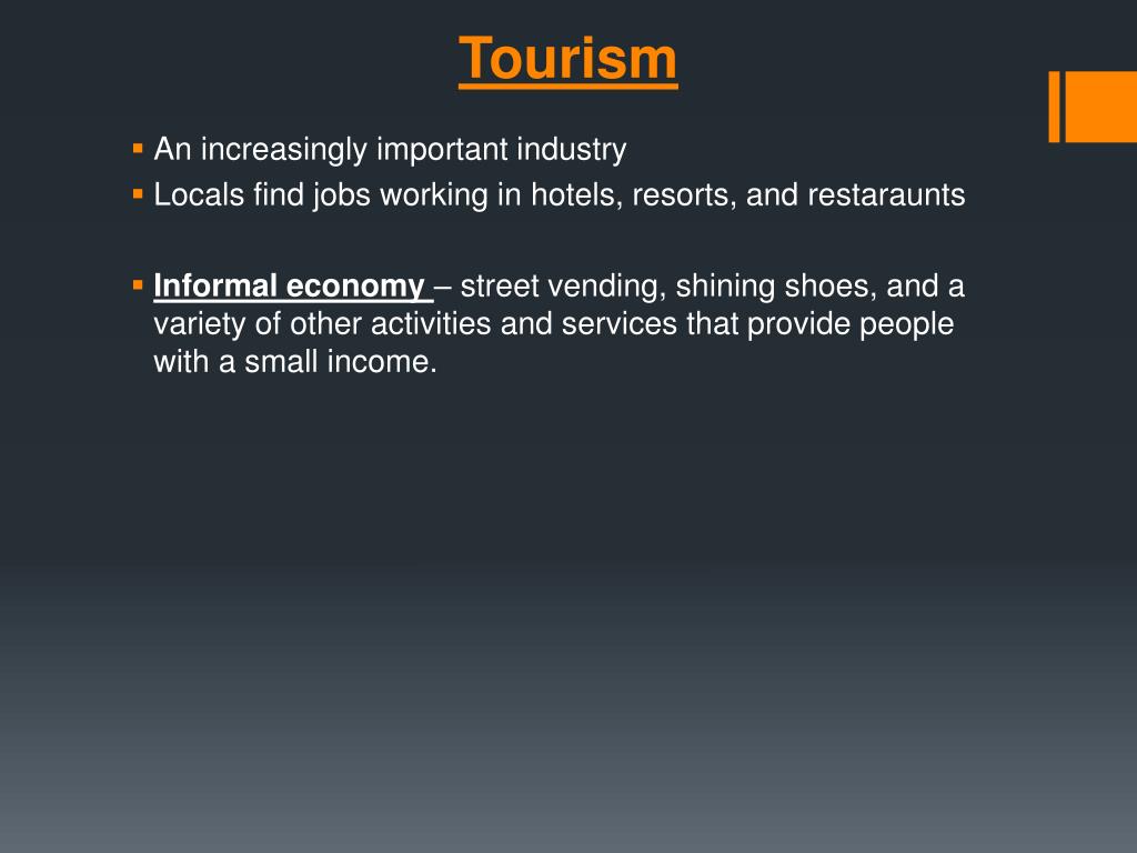 Tourism • An increasingly important industry • Locals find jobs working in hotels, resorts, and restaraunts • Informal economy – street vending, shining shoes, and a variety of other activities and services that provide people with a small income.