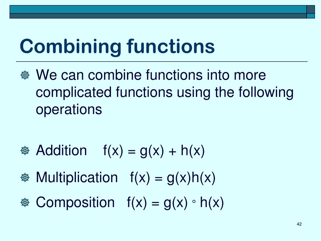 Combining functions • We can combine functions into more complicated functions using the following operations • Addition f(x) = g(x) + h(x) • Multiplication f(x) = g(x)h(x) • Composition f(x) = g(x) ° h(x)