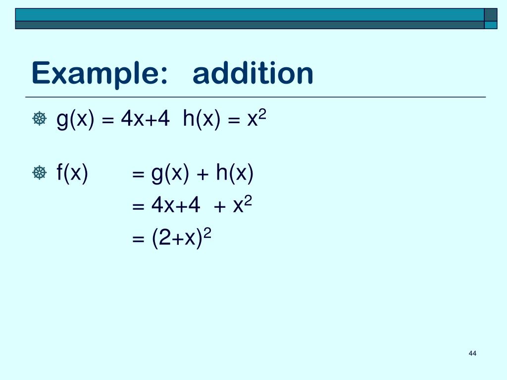 Example: addition • g(x) = 4x+4 h(x) = x2 • f(x) = g(x) + h(x) = 4x+4 + x2 = (2+x)2