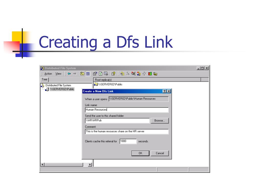 Configuring New Dfs Links • Users can browse folders under a Dfs root without knowing where the referenced resources are physically located. • After you create the Dfs root, you can create Dfs links. • To create a Dfs link, use the Distributed File System snap-in to open the Create A New Dfs Link dialog box.