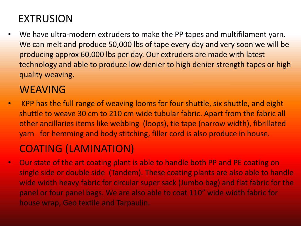 EXTRUSION • We have ultra-modern extruders to make the PP tapes and multifilament yarn. We can melt and produce 50,000 lbs of tape every day and very soon we will be producing approx 60,000 lbs per day. Our extruders are made with latest technology and able to produce low denier to high denier strength tapes or high quality weaving. WEAVING • KPP has the full range of weaving looms for four shuttle, six shuttle, and eight shuttle to weave 30 cm to 210 cm wide tubular fabric. Apart from the fabric all other ancillaries items like webbing (loops), tie tape (narrow width), fibrillated yarn for hemming and body stitching, filler cord is also produce in house. COATING (LAMINATION) • Our state of the art coating plant is able to handle both PP and PE coating on single side or double side (Tandem). These coating plants are also able to handle wide width heavy fabric for circular super sack (Jumbo bag) and flat fabric for the panel or four panel bags. We are also able to coat 110” wide width fabric for house wrap, Geo textile and Tarpaulin.