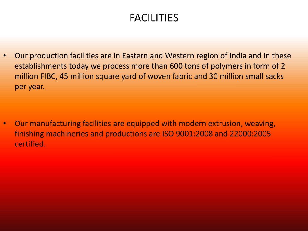 FACILITIES • Our production facilities are in Eastern and Western region of India and in these establishments today we process more than 600 tons of polymers in form of 2 million FIBC, 45 million square yard of woven fabric and 30 million small sacks per year. • Our manufacturing facilities are equipped with modern extrusion, weaving, finishing machineries and productions are ISO 9001:2008 and 22000:2005 certified.