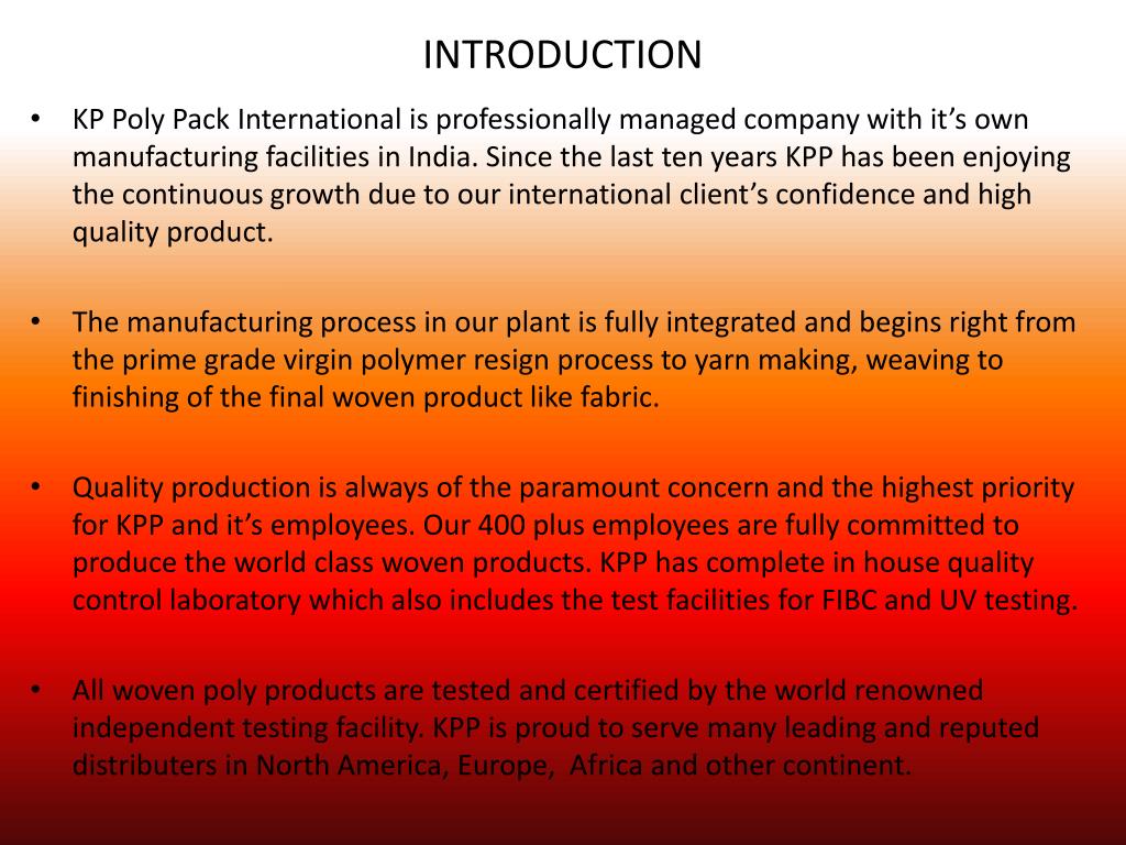 INTRODUCTION • KP Poly Pack International is professionally managed company with it’s own manufacturing facilities in India. Since the last ten years KPP has been enjoying the continuous growth due to our international client’s confidence and high quality product. • The manufacturing process in our plant is fully integrated and begins right from the prime grade virgin polymer resign process to yarn making, weaving to finishing of the final woven product like fabric. • Quality production is always of the paramount concern and the highest priority for KPP and it’s employees. Our 400 plus employees are fully committed to produce the world class woven products. KPP has complete in house quality control laboratory which also includes the test facilities for FIBC and UV testing. • All woven poly products are tested and certified by the world renowned independent testing facility. KPP is proud to serve many leading and reputed distributers in North America, Europe, Africa and other continent.
